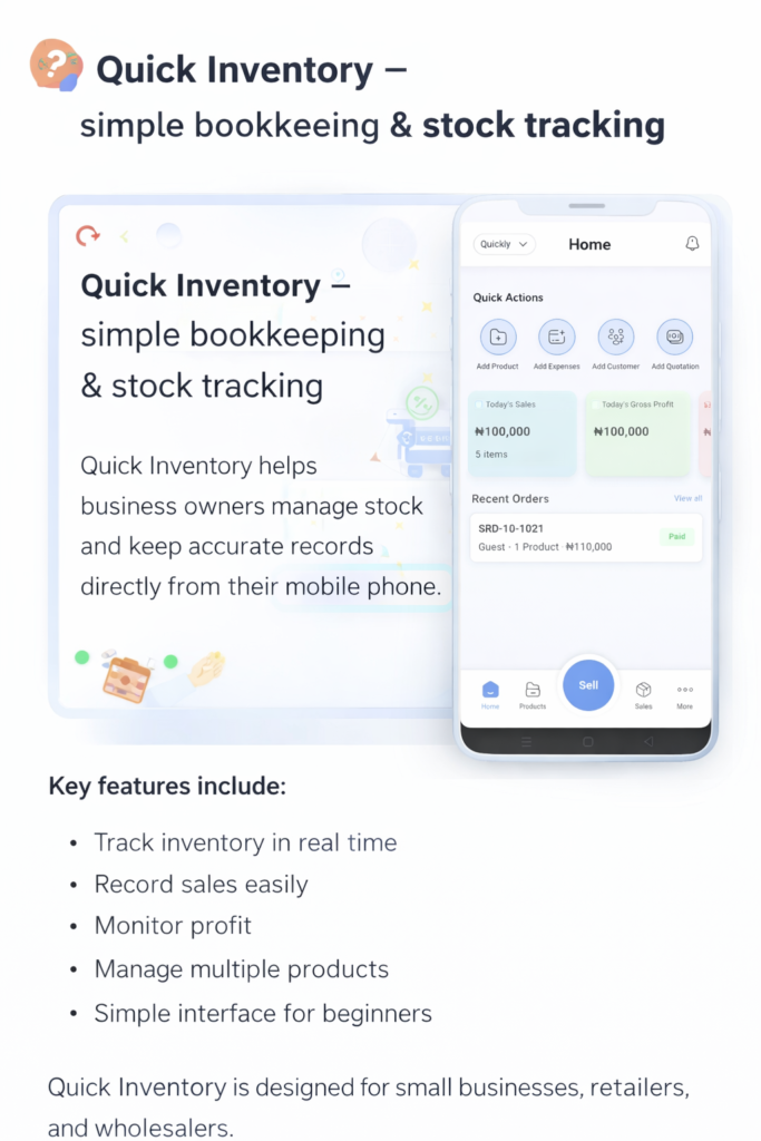 Quick Inventory helps business owners manage stock and keep accurate records directly from their mobile phone.